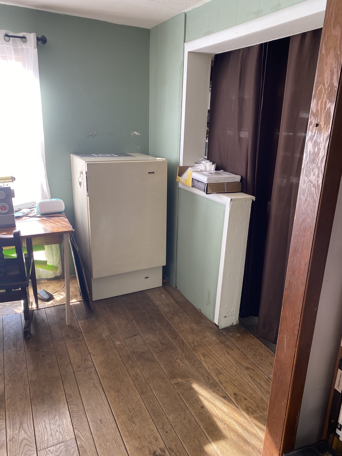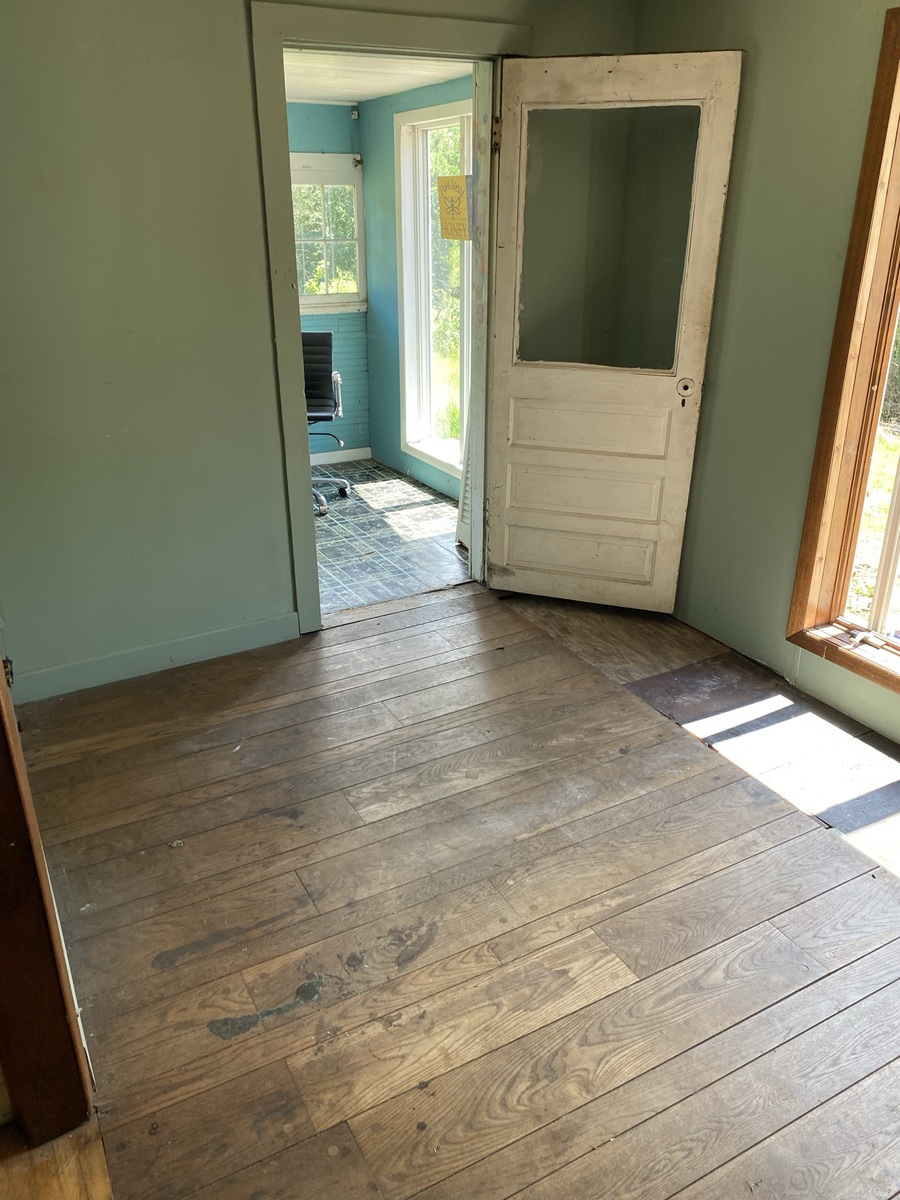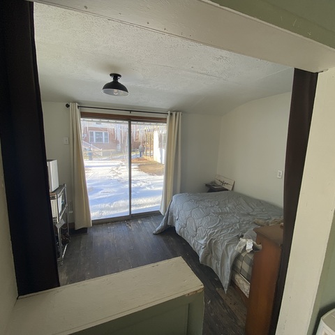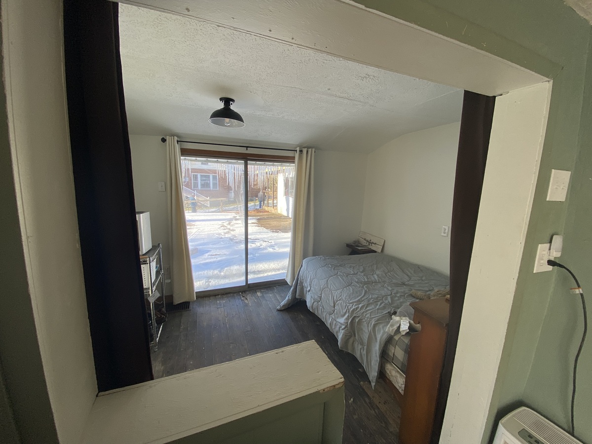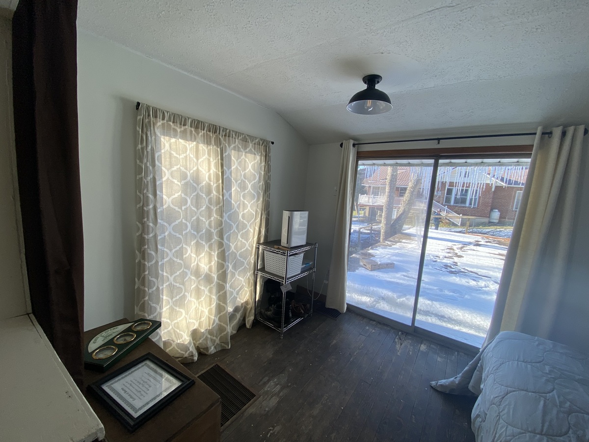 There is currently no door to the inside of this room, only a curtain - This room has a sliding glass door to the deck. We have used this room for a bedroom and is currently a walk in pantry.