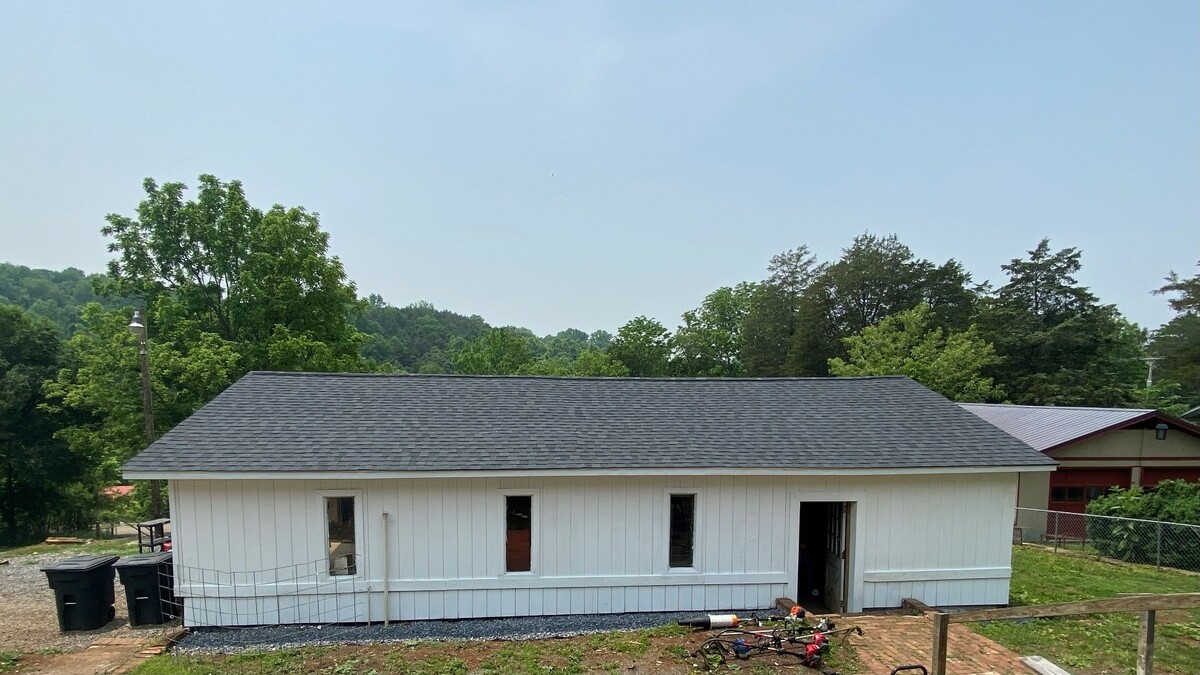 The garage features two bay doors and a side entrance door leading to the house. Its dimensions are 20' x 40'. The floor is concrete, and while there are some necessary repairs to the siding, one side has already been completed. During the replacement of the siding on the front facing the house, a French drain was also installed.